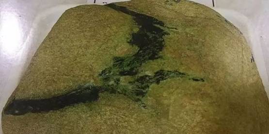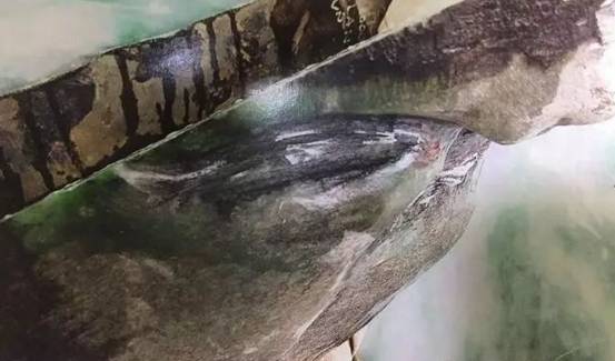 如果癣的边缘轮廓不太规则,其颜色多呈亮黑色,并向边缘过渡为黄绿色,甚至会转化为松花,癣中角闪石晶体相对细小,且有明显的碎裂痕迹,晶形不完整,品面不发育,未见明显的马牙石状,这样的癣一般会出现“喷色"现象,癣脚下出现高色的可能性也比较大。