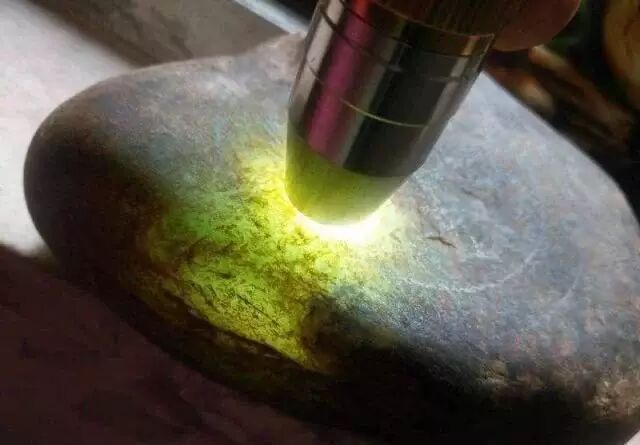 水石类翡翠原石的外部皮质光滑,大多没有沙感,表面具有水冲的痕迹,所以在放大镜下观察能够见到粒状及小凹洞,皮及薄,水皮石就是由于皮薄,所以比较容易透视其内部的颜色,颜色呈淡绿色至鲜绿色,打灯有着明显的区别。