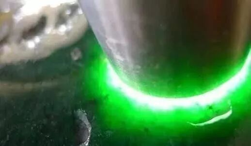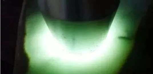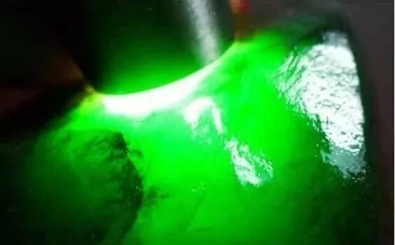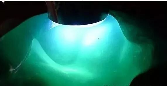 用强光手电筒紧贴合翡翠背面,然后慢慢平移。以此来鉴定翡翠结构内是否含有杂质或有裂口,有杂质时,翡翠内部会呈现暗点,有内裂口时,在手电光源平移时会出现手电光源普通暗反应,或有不均匀折射光变化反应。
