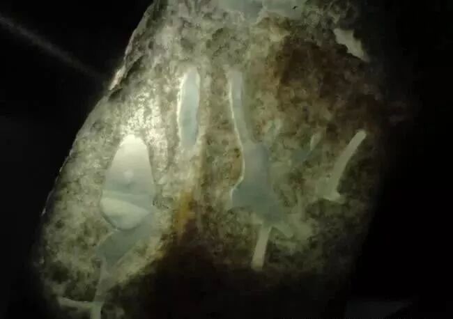 我们从表面可以看到原石的纹裂,但是不能看到这些纹裂的深度,打灯之后,这些纹裂都明显可见,到什么地方,有多严重,都有比较直观的表现,我们就可以判断原石的成品率有多大,可以切手镯呢还是只能切牌子戒面。