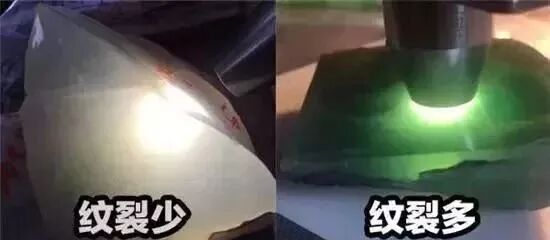 比如裂、脏等,有裂的地方会有隔光效应,打灯的时候不能用太亮的光线,因为太亮的光线会打穿裂纹透光,这样是看不到隔光效应的,会导致判断失误的。
