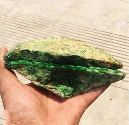 今天给大家介绍一块在翡翠界非常具有特色的一种翡翠原石,首先先说这块原石的场口吧,这块原石是来自木那场口的,重达1.3公斤,有一半是断口,经过长久的风化已经形成了新的皮壳层,但肉质却已经暴露出来了,所以我们一眼就认定这是一块花青种翡翠。