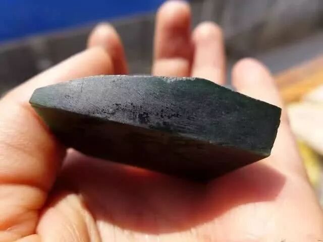 原石切开后果然没让我们失望,黑黑的一片,这是刚切出来的薄片,用来做挂件。