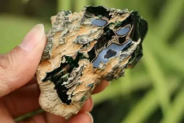 可以看到原石基本上是满肉的状态,没有什么皮壳了,肉质发黑发亮,外行朋友可能以为这就是块破石头,没啥看头,那你就错了!