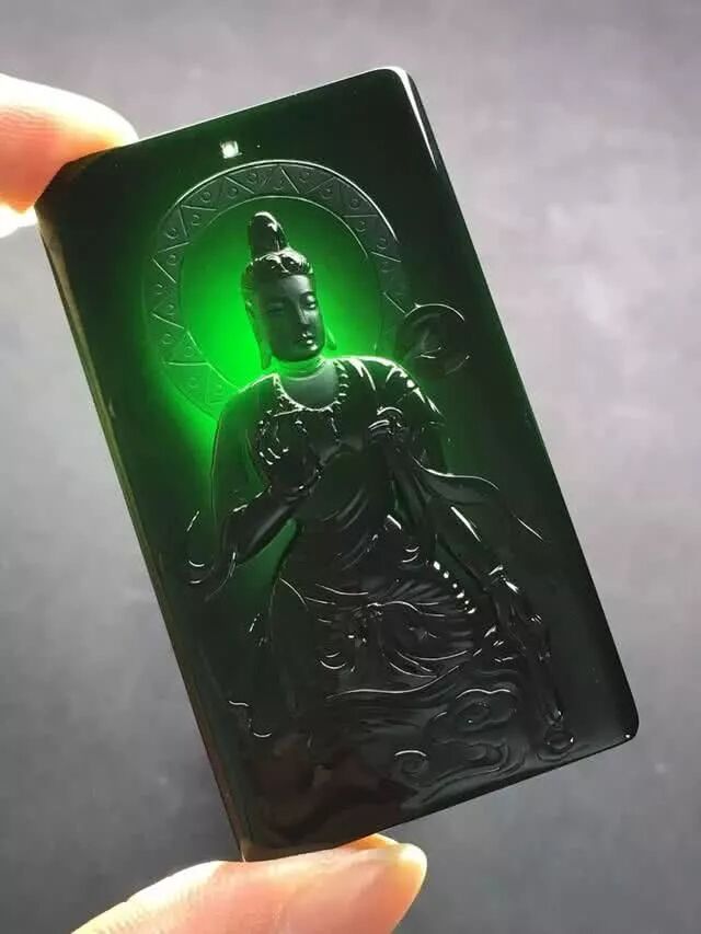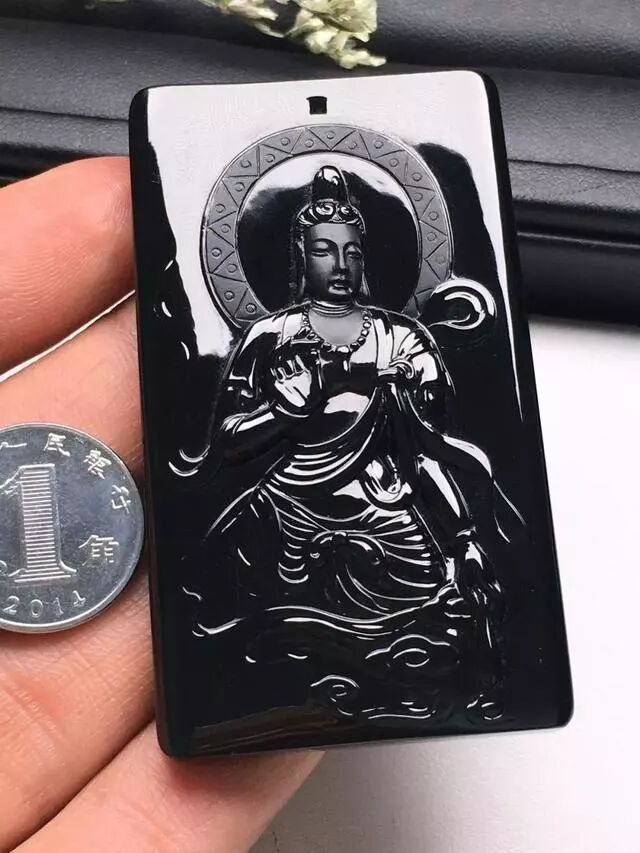 看看这块墨翠做出来的成品,按最大的材料先出了个观音牌挂件,这观音雕刻的真是巧夺天工啊。