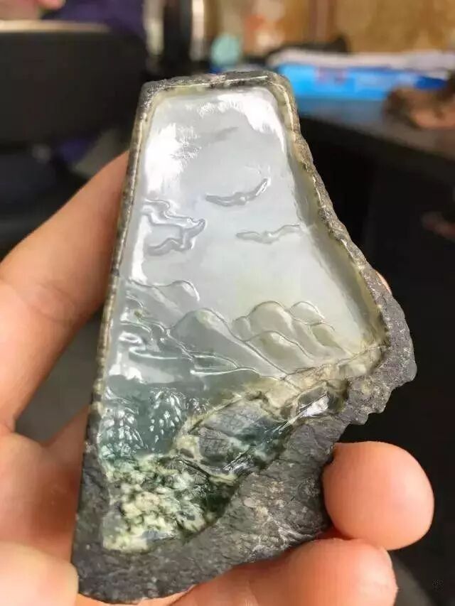 开窗后的效果,种水属于标准的糯化种,独具特色的是肉中飘有绿花,像水草一样飘在湖中,还未雕刻的原石已经特别美丽了,这料子非常适合做山水或者是鱼草。