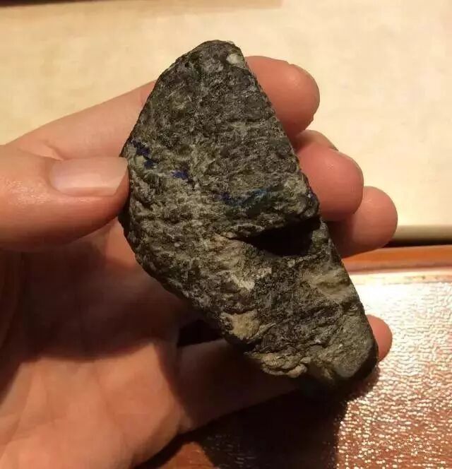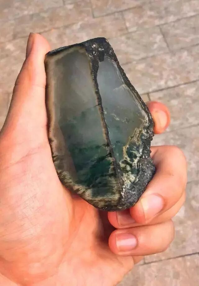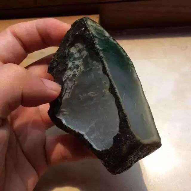 我手上拿着这块原石是莫西沙场口的底层料子,黑砂皮,料子个头小,其貌不扬,整个石头全黑。莫西沙场口的料子就是这样的特点,皮壳与普通石头无异,而内部却是另一番天地,原石一侧有不少绿色松花,洒水后更明显,推断内部是有飘花。