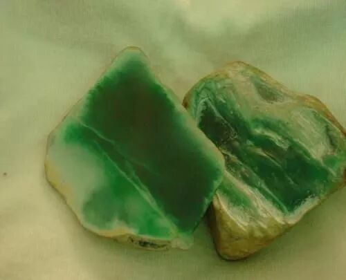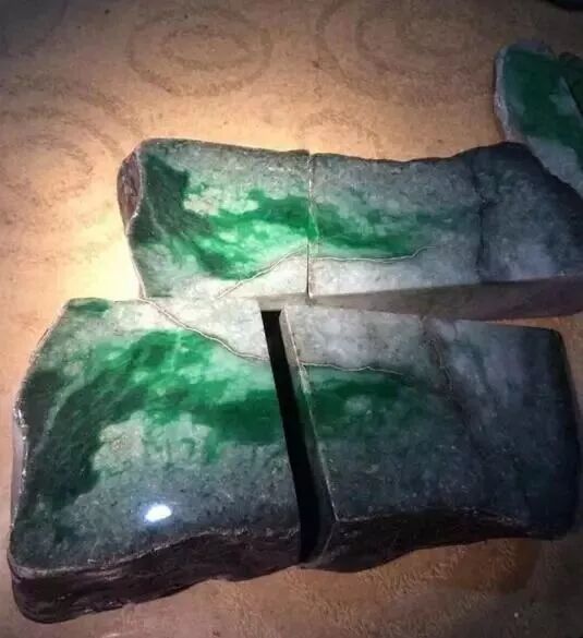 对于翡翠原石中的绿色形状特点来说,“一条线”带子绿与“一大片”靠皮绿是同一种绿色形状的两种表现形式,是线立性与片卧性的分别。“线”的厚度是已知的,而深度是未知的;“片”的面积是已知的,而厚度是未知的。一般赌一条线涨的机率要比一大片高很多!接下来给大家看一些蟒带切开后的对比: