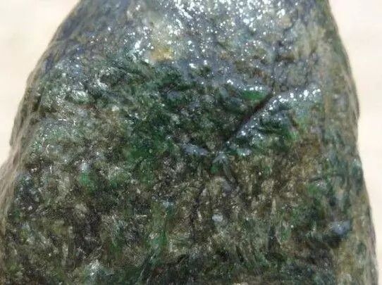 蟒突出于表面,细腻光滑,用手摸不会感到粗糙。绿在翡翠原石的鼓包处是好绿,在凹处的绿就差一些。行话讲“宁买十鼓,不买一瘪”,如蟒上有松花那就是更好的预兆。蟒的形态、颜色、走向、倾向是判断翡翠原石绿色变化的重要标志。