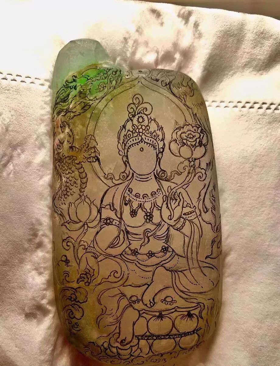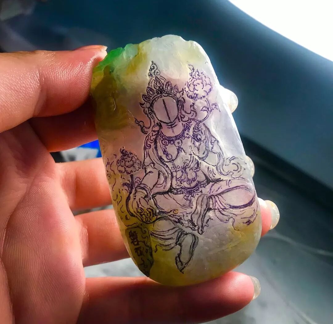今天给大家分享的是一块三色翡翠片料制作雕刻观音的过程,我们一起来看看吧!这块翡翠片料种特别好,肉质细,颜色丰富,浓郁的黄雾包围了全身,绿色作为一个亮眼点缀的存在,片料中间是带着点白肉,白肉部分带着点雪花棉,很有特色!