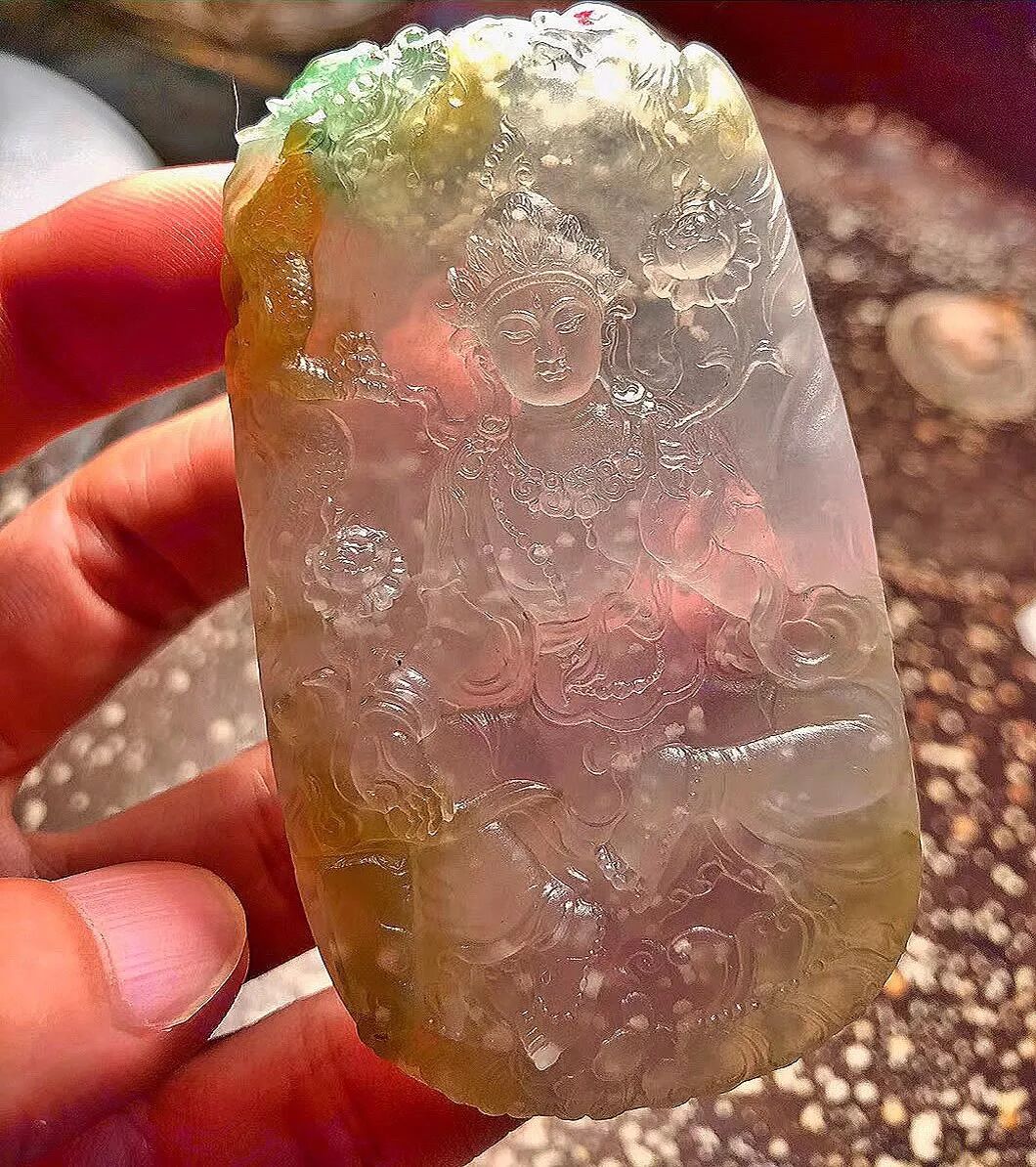 一块带有雪花棉的三色翡翠片料,雕刻端庄的持莲观音,美翻了!