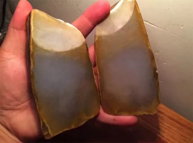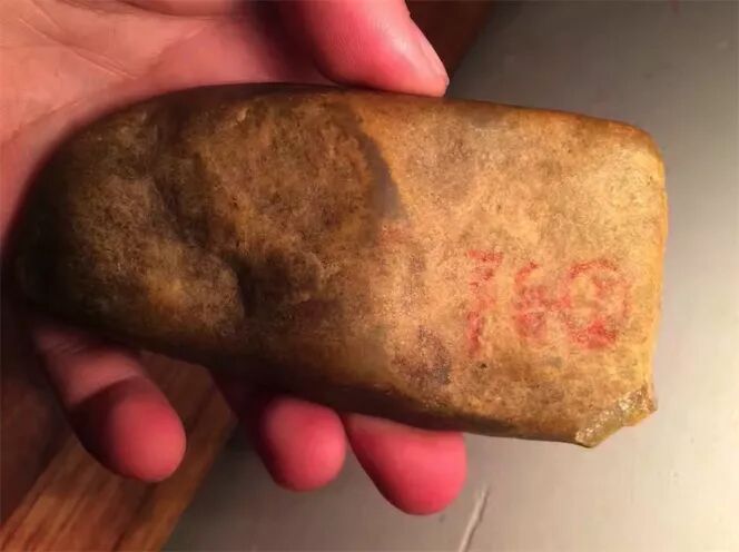 手中拿的是一块石头来自大马坎场口的翡翠原石,3500淘到手的,有330克重,皮壳较薄,黄雾油润光滑。