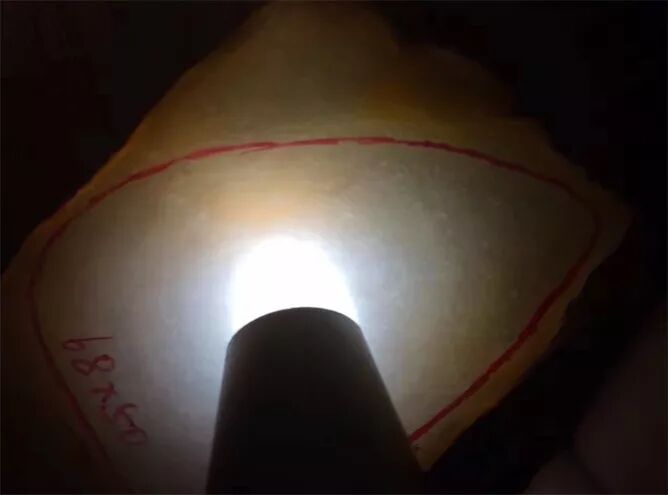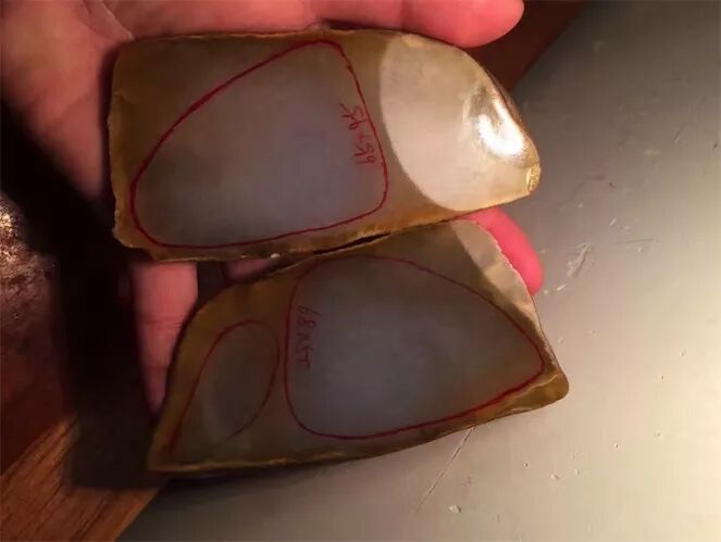 原石从中间一分为二,图片因为灯光问题一眼看上去是糯冰种,其实整块翡翠的肉质达到了冰种,种水特别好,雾所处在位置非常有特点也怪,所以这就是传说中的怪庄,大马坎专出怪庄料,也是比较稀少。