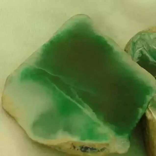 翡翠中的绿色部分以呈团状和条带状集中分布者较有价值。这样的绿色显露于表皮时往往也呈团状或线状,也有时会呈片状。当绿色在表皮上以大面积片状出现时多为表皮绿,其内部往往无绿;而当绿色在表皮上呈线状或团状出现时,特别是当表皮上露出的绿线呈对称分布时,其绿会向内部延伸,甚至贯穿整块翡翠原石。后者的价值自然比前者高,因此,有行话说“宁买一线,不买一片”