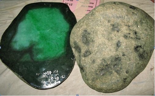 翡翠原石除原生玉石(岩石玉)之外,几乎所有玉石(砾石玉)都被皮壳包裹着,让人难见其真容。