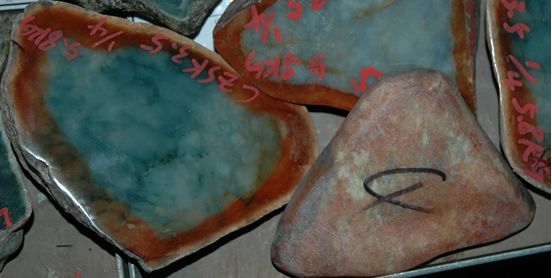 从原石的解剖面看,翡翠玉料从表到里由皮壳、雾、玉肉三个部位构成。