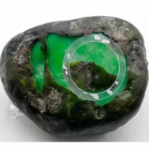 铁锈皮为黑黄,它可以出现在不同颜色的沙壳上,一条条宽窄不等,有的是片状走向,有的是块状。铁锈壳如果沙粒适中,翻得有力而规整,切割后底和色都好,他们大多数底灰,如果它是高绿的,就可以克服底灰的毛病。不怕底灰,只怕无色,一经有色,色必是又翠又水。