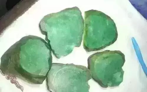 没想到一刀下去,其貌不扬的石头切出来了这绿油油的一片,色已经到位了,就看一下有没有裂,结果一点裂也没有,可谓大涨呀!