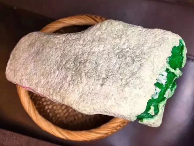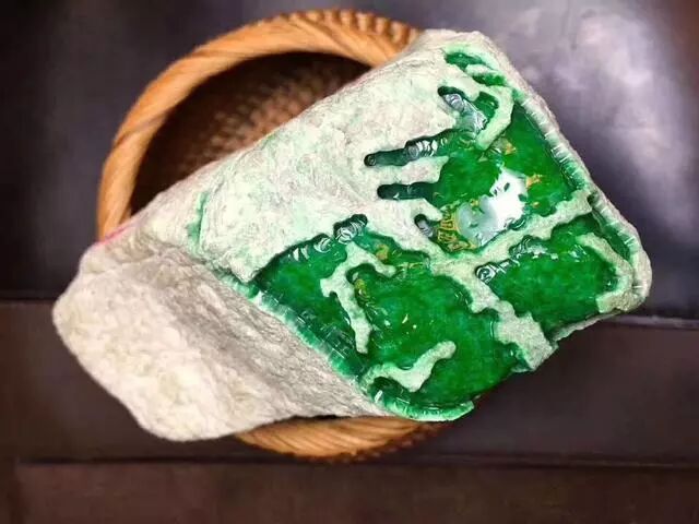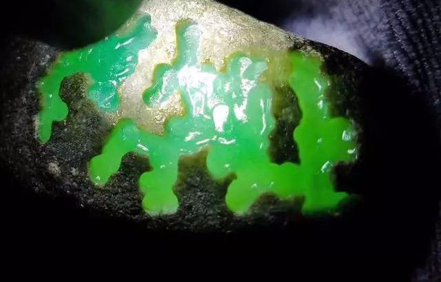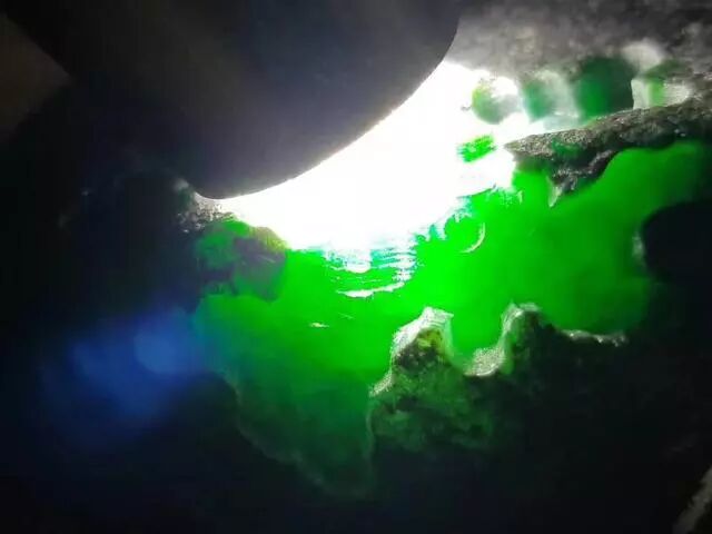 仅仅开了这么一个小窗口,就有一大片深绿色的翡翠冒出来,就好像是火山喷发的样子......