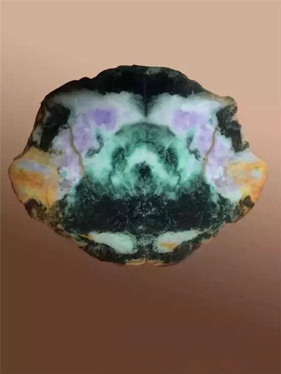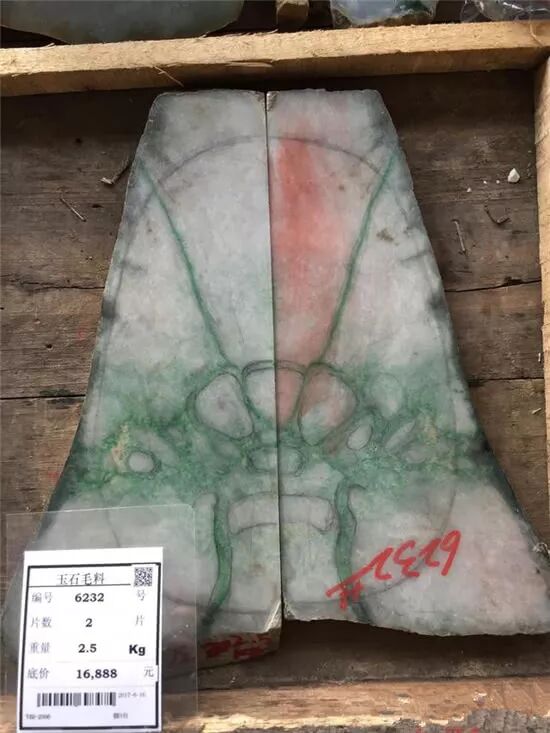 下面这块翡翠原料来自于今年6月23日的标场。主人一刀切开后,赌石种水十分一般,但发现左右两边的色带竟形成了神奇的图案。