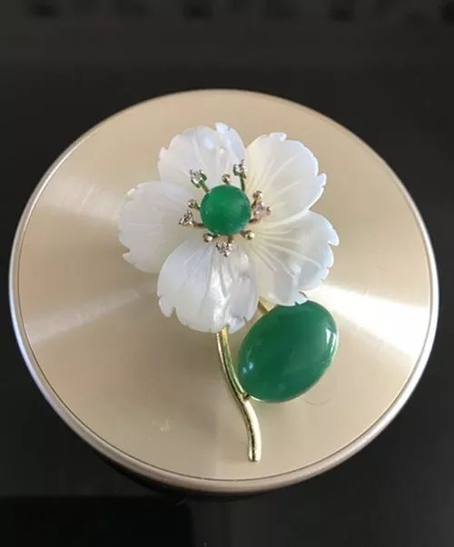 翡翠胸花也以镶嵌款式为主,多用铂金、黄金、珍珠、钻石与之相配。