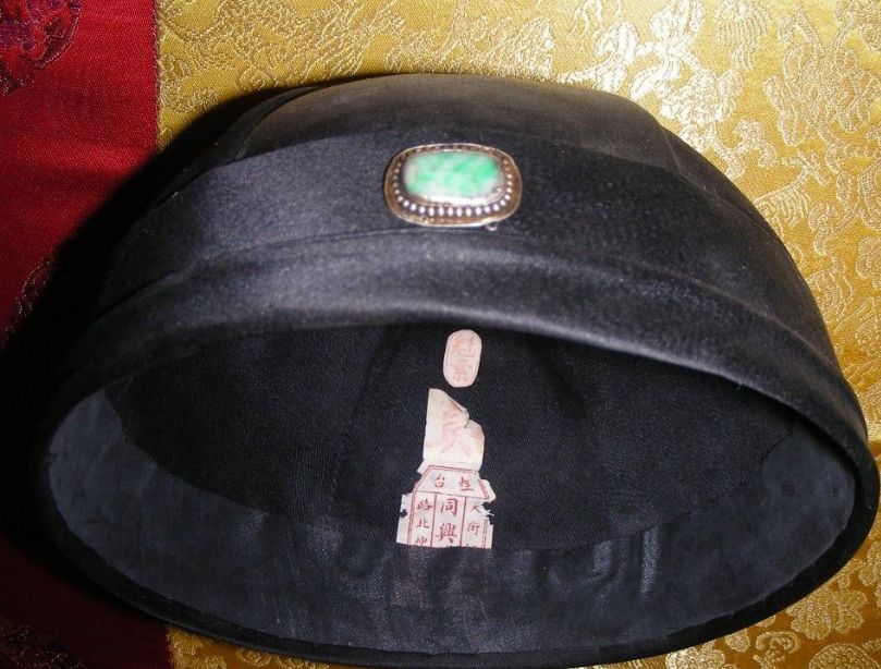 翡翠帽正,是旧饰中缝制在帽前正中的方形或椭圆形的素身翡翠。