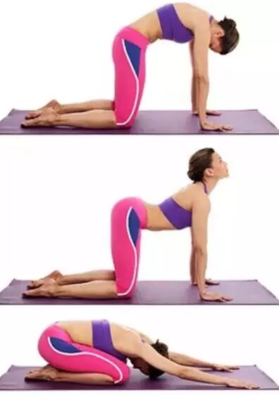 双腿放松,身体不动,呼气,同时背部向上供起,轻轻收缩腹部,是为猫式。