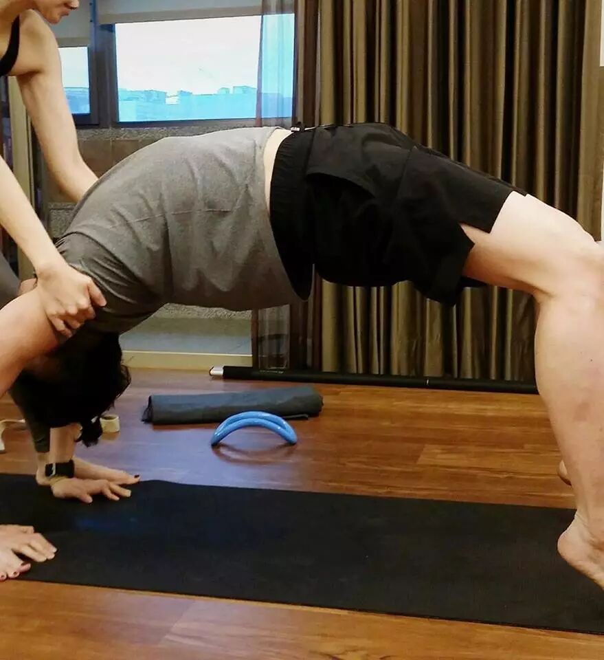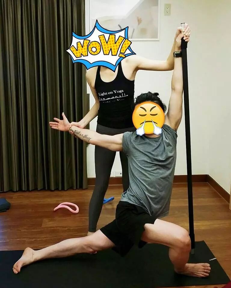 在瑜伽教练的指导下,苏有朋做着高难度瑜伽动作,看上去有模有样,私底下肯定练习过很多次了。