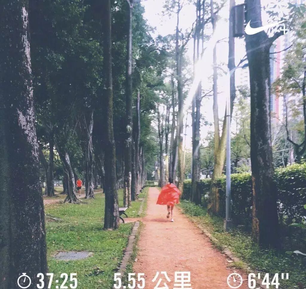 怀孕20周:冒着小雨在公园里狂奔,跑到快模糊了!跑了5.55公里,配速644,用时37分25秒。