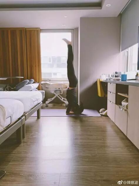 从照片中可以看出,陈意涵在产房做瑜伽,倒立动作轻松完成。黑色紧身裤下双腿纤细,露出来的腹部没有一点小肚子的痕迹,平坦得让人羡慕!
