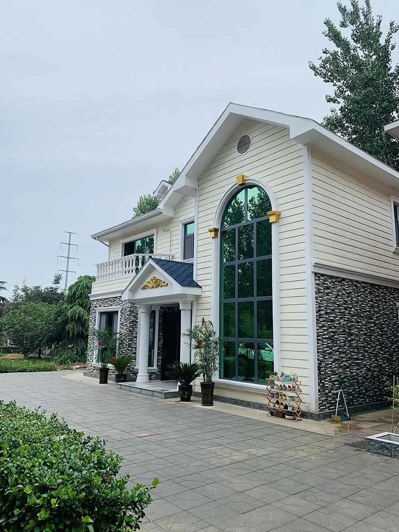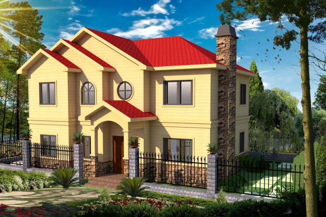 7、轻钢房外观美丽:轻钢别墅的设计外观可随意性,由于是钢材可以设计任何形状,让房屋更具有看点,同时施工时难度也低,只需安装即可把漂亮的别墅建成。