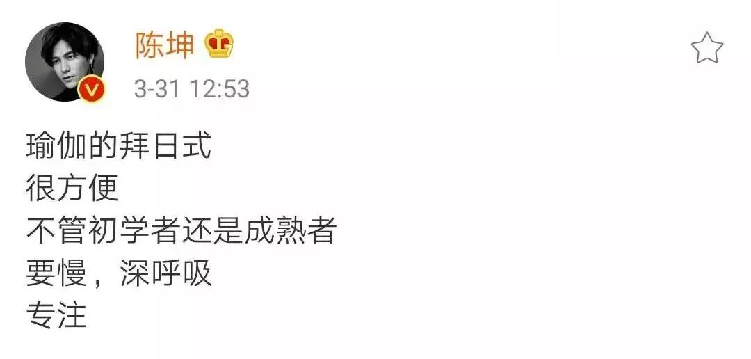 已经瑜伽18年的陈坤在社交网络上,分享瑜伽拜日心得:“瑜伽的拜日式很方便,不管初学者还是成熟者,要慢,深呼吸,专注……”
