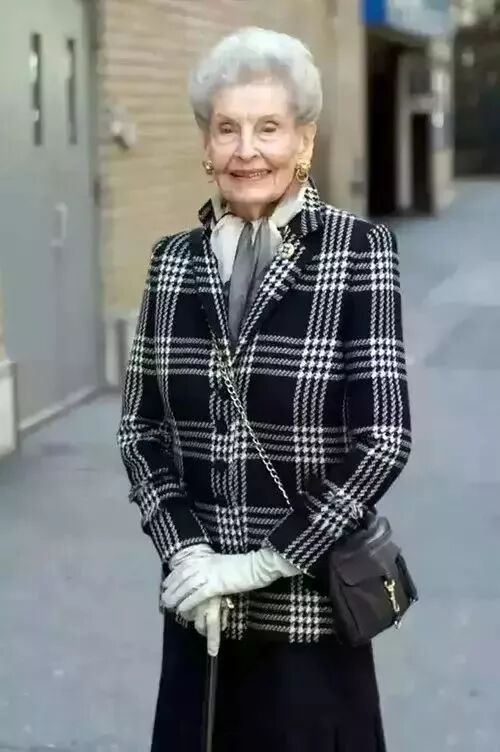 ▲毫不佝偻的腰身足够配的上精致裁剪的小西装,气场十足。没人会猜到,这位“老太太”被美好精致的外在藏起来的年龄整整100岁。