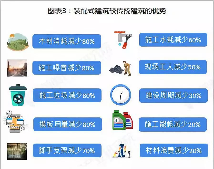 相对于传统现浇建筑,装配式建筑可缩短施工周期25-30%,节水50-60%,节约木材约80%,降低施工能耗约20%,减少建筑垃圾70%-80%,并显著降低施工粉尘和噪声污染。