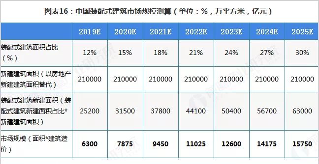 根据住建部发布的装配式建筑造价参考依据,以2500元/平方米(考虑到技术水平上升和物价提高对价格水平带来的不同影响,假设未来几年造价不变)为基础,以房地产新建建筑面积替代城镇新建建筑面积进行测算,及至2025年我国装配式建筑市场规模将达到15000亿元以上。