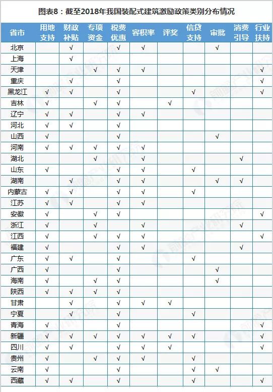 前瞻产业研究院根据我国31个省份/直辖市的装配式建筑实施意见、规划和行动方案,归纳了省级地方在装配式建筑推广方面采取的政策情况。