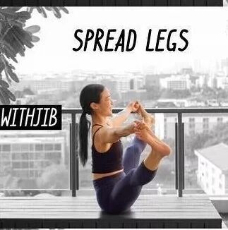手抓脚大拇指,双腿大大分开,手脚对抗的力量使胸腔打开更多一些