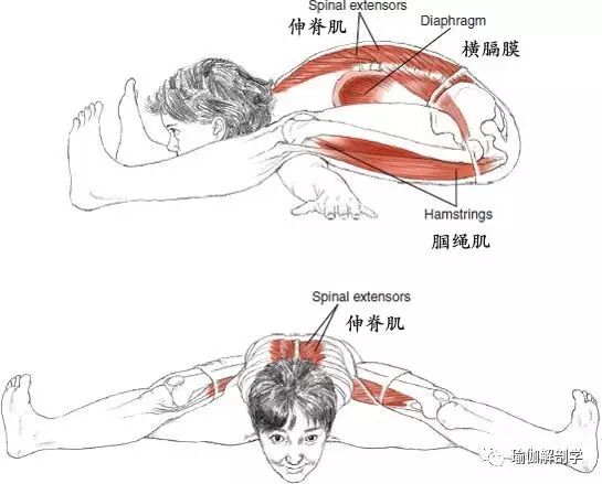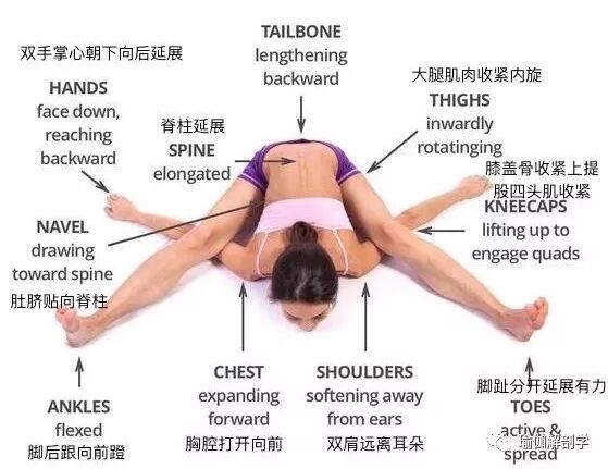 长坐姿坐立在垫面的中央,双脚打开适当的距离,微屈双膝,双手侧平举,身体向前,将右手从右膝下方穿出,将左手从左膝下方穿出,身体再次向前,靠近地面,双手臂从膝盖下方向两侧伸直的同时,双膝也随之伸直,下巴点地,眼睛看向前方。