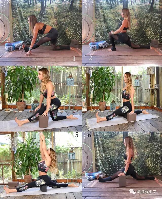 山式站立在垫子前端,将右腿向后迈开一大步,脚背贴地,脚尖指向正后方;屈左膝,双手放在身体右脚的两侧;尽量将右腿向后伸展,将右小腿大腿慢慢靠近地面;抬起左脚,慢慢的向前伸直左腿,直到左腿后侧以及右腿前侧全部贴实垫面,慢慢的立直上提,呼气,双手臂从体侧向上,头顶合十。