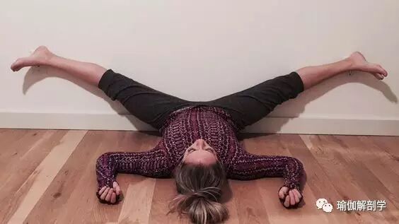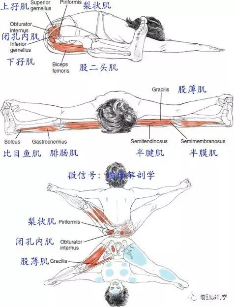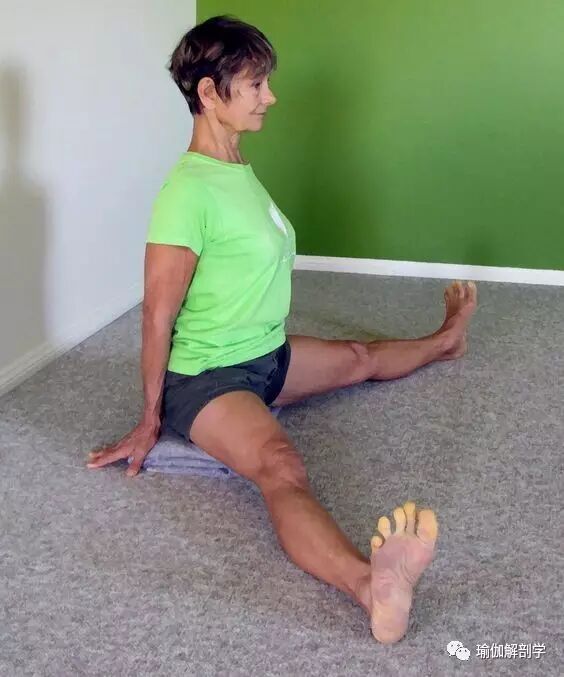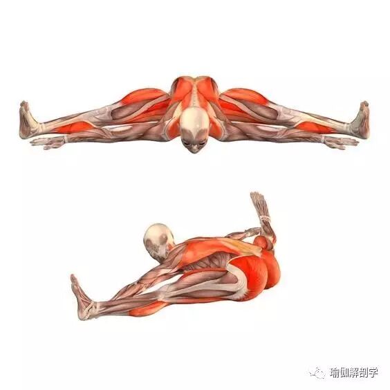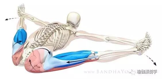 脊柱微屈曲,髋关节外展屈曲、膝关节伸直、踝关节背屈,肩关节外展,肘关节伸直。坐角式关节及肌肉的用力走向如下图: