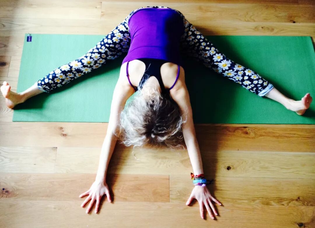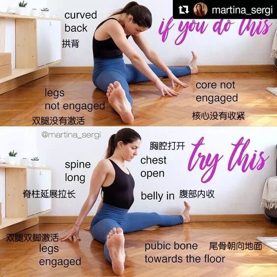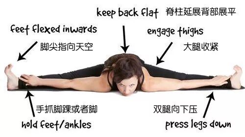 长坐姿准备,根据个人的情况,双腿打开到适当的距离,脚尖回勾,双腿肌肉收紧,压实垫面,头顶带动身体向上延展,吸气,双手侧平举,呼气,保证身体躯干整体向前向下,落双手,根据个人的情况,双手可放在身体的前方,亦可以抓住双脚。
