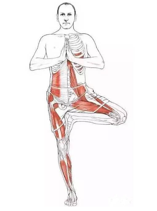 这实际上是相当不安全的,也无法在体式保持中正确发力。膝盖的骨骼结构决定了其不是最稳定的关节,根据解剖学原理,膝关节的稳定性欠佳,所以体位中应尽量避免踩压。另外,树式中脚踩膝关节外侧的力使腿部韧带变形,仿佛形成拉弓的状态,长此以往会格外损伤腿部韧带,不利于长久练习。