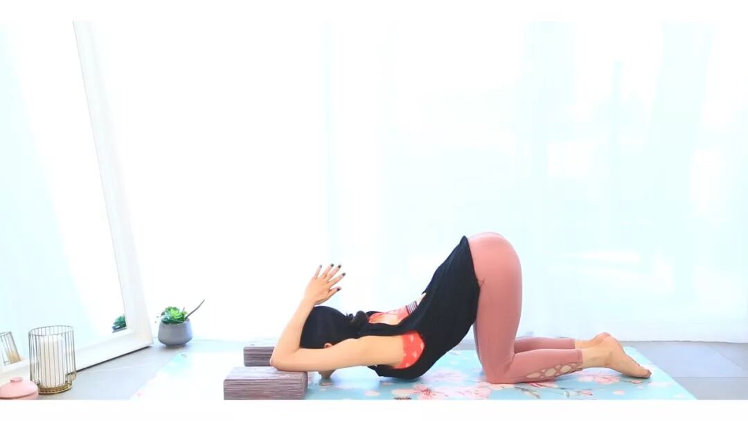 双手放在瑜伽砖上,膝盖点地,小腿贴紧垫面