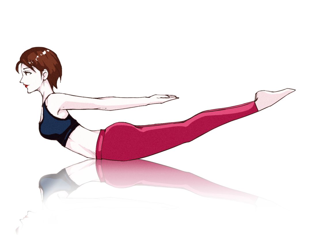1.俯卧,两臂向后伸直,呼气,同时抬起头、胸膛、双腿。