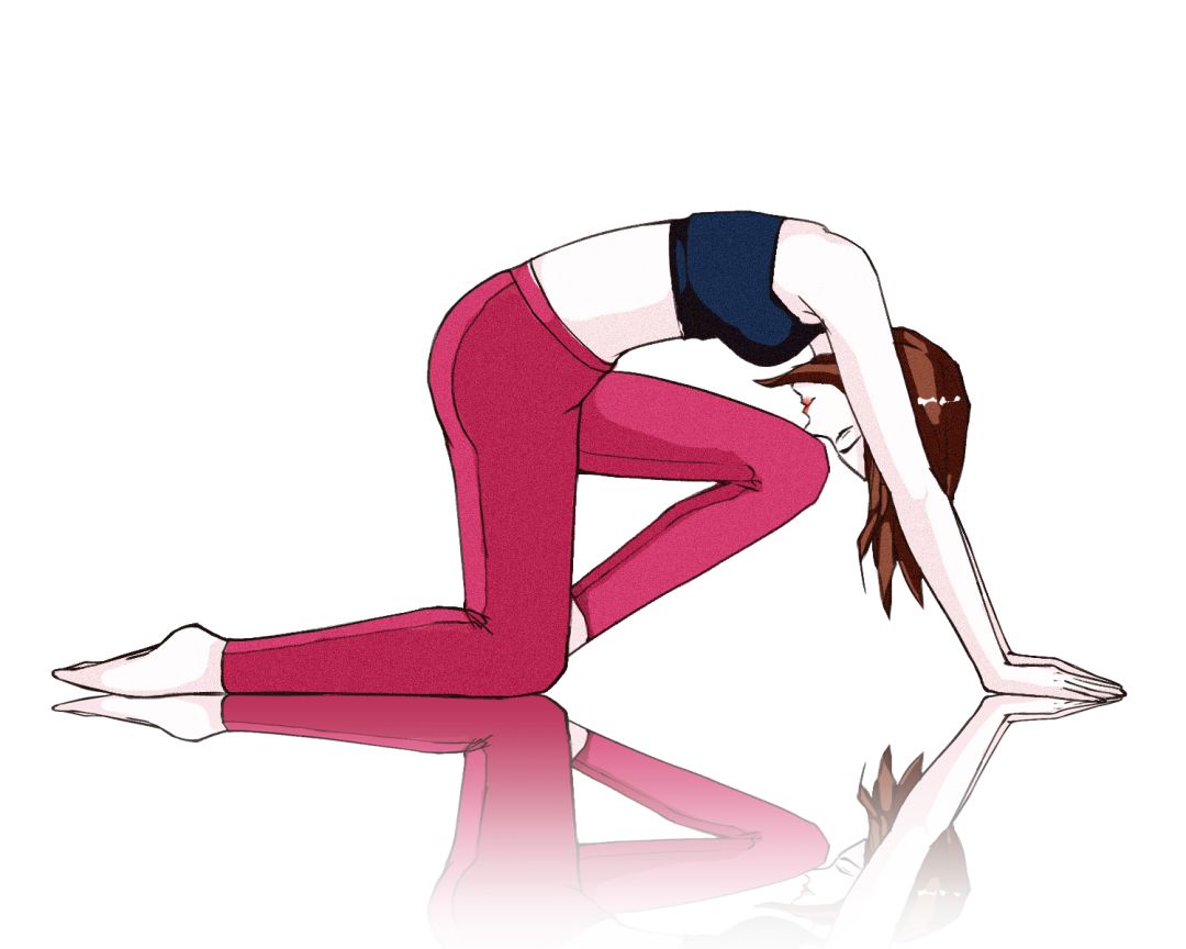 3.呼气,垂下头,拱起脊柱,再保持5秒钟。两臂伸直,垂直于地面。