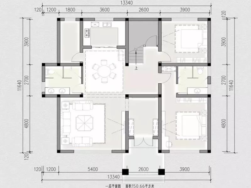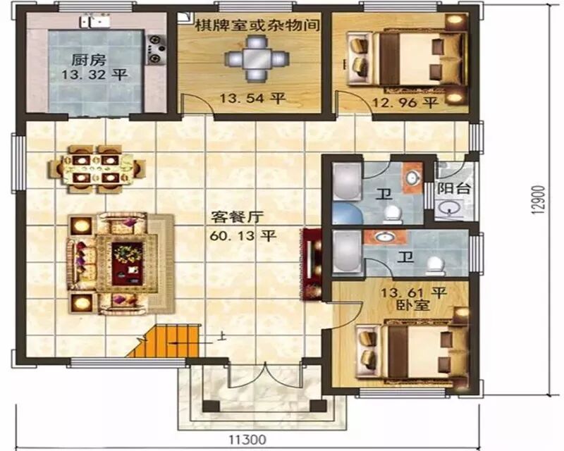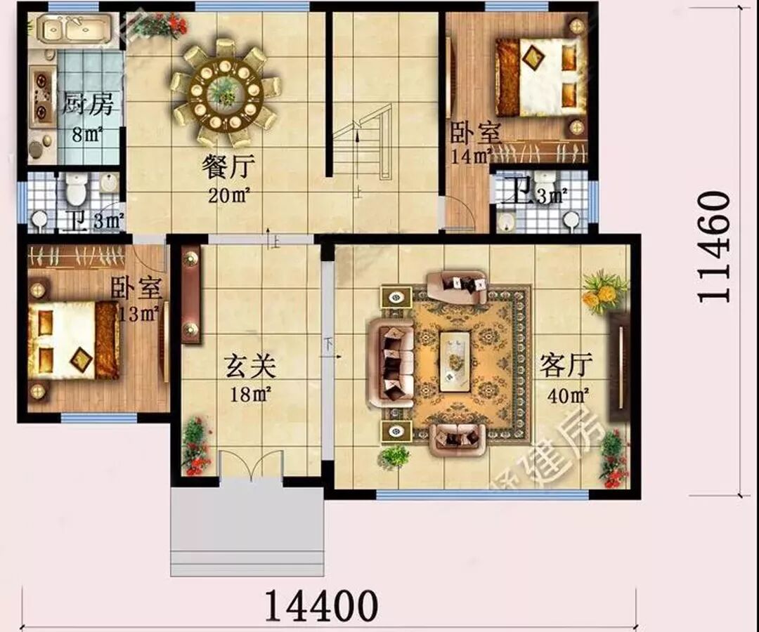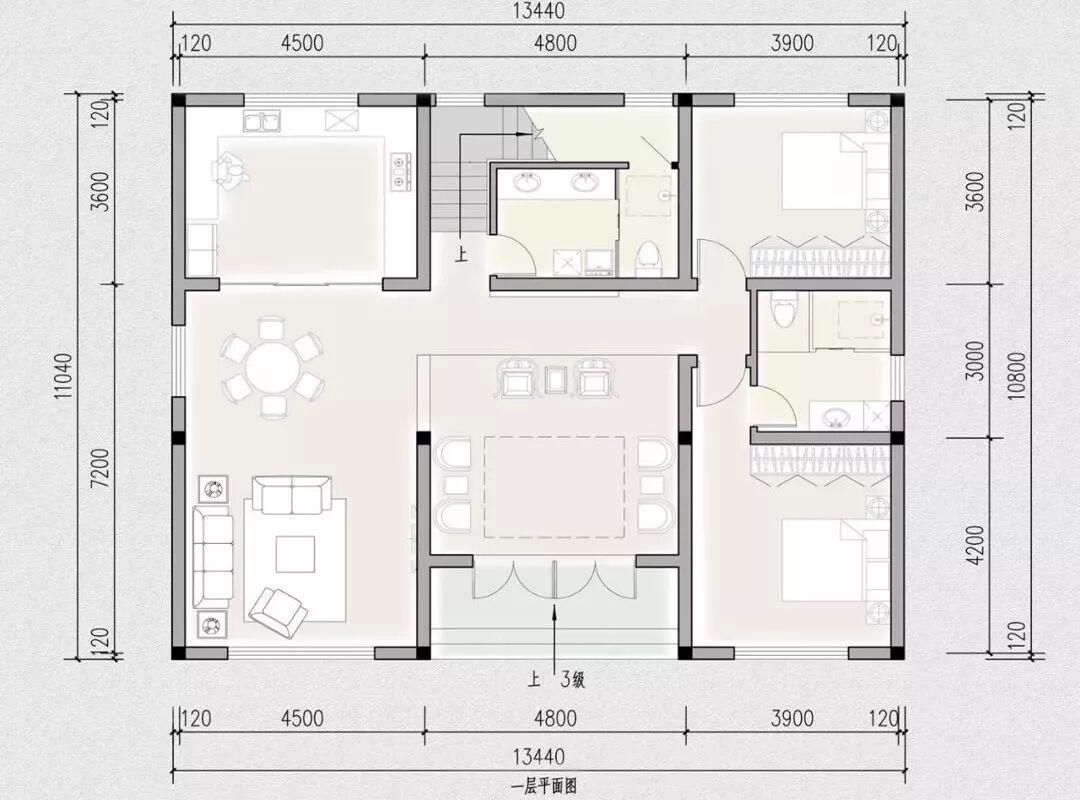 一层设有:客厅、餐厅、厨房、2间卧室、2间卫生间;