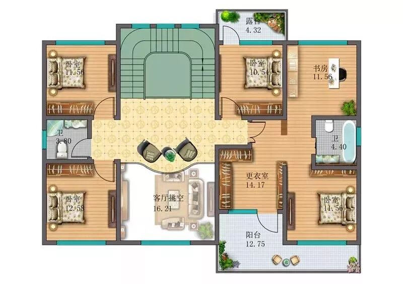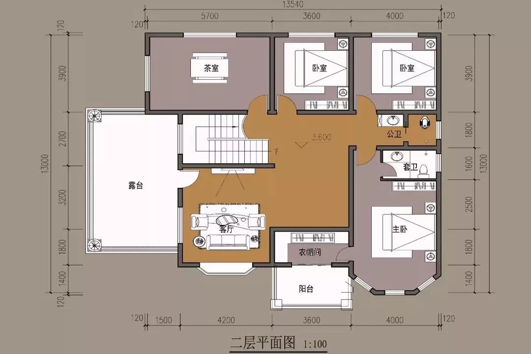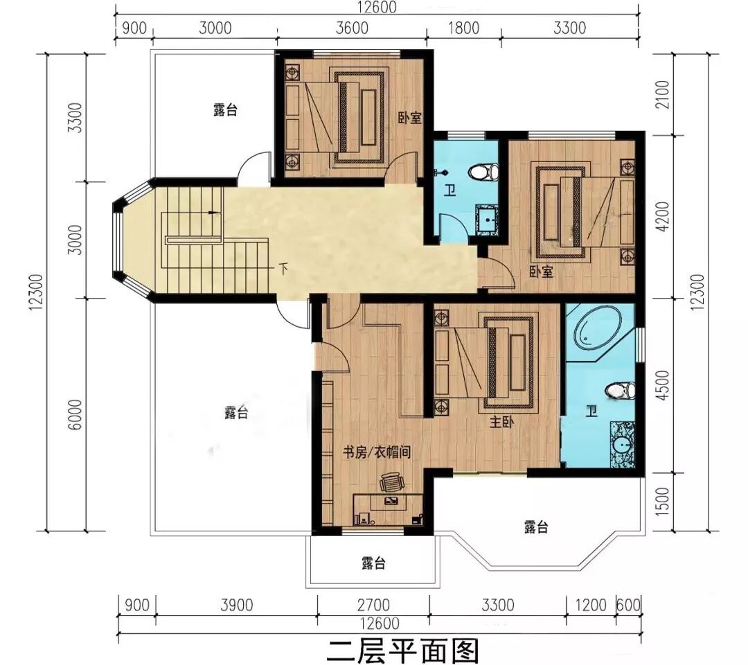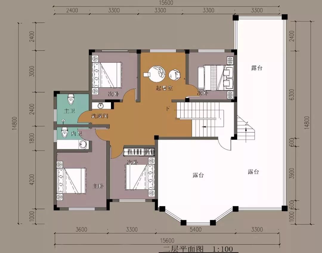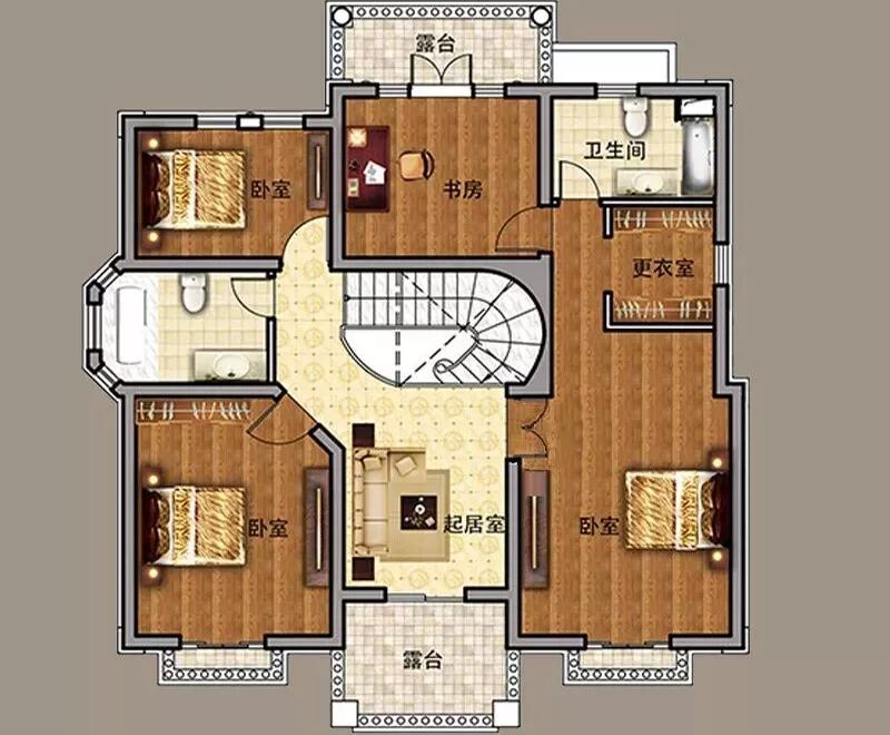 二层设有:起居室、3间卧室、衣帽间、卫生间、露台。