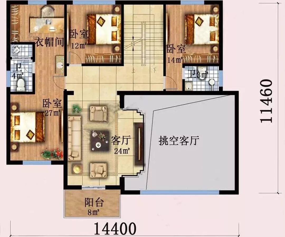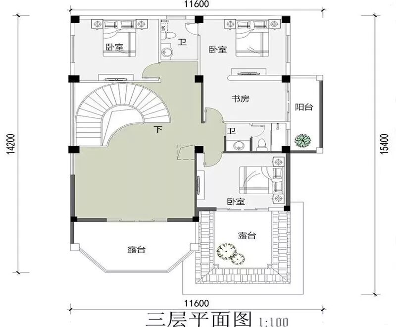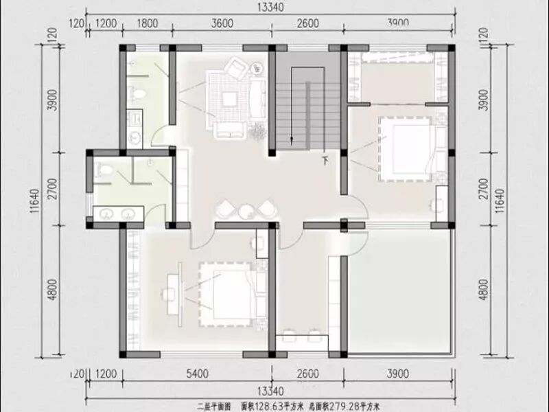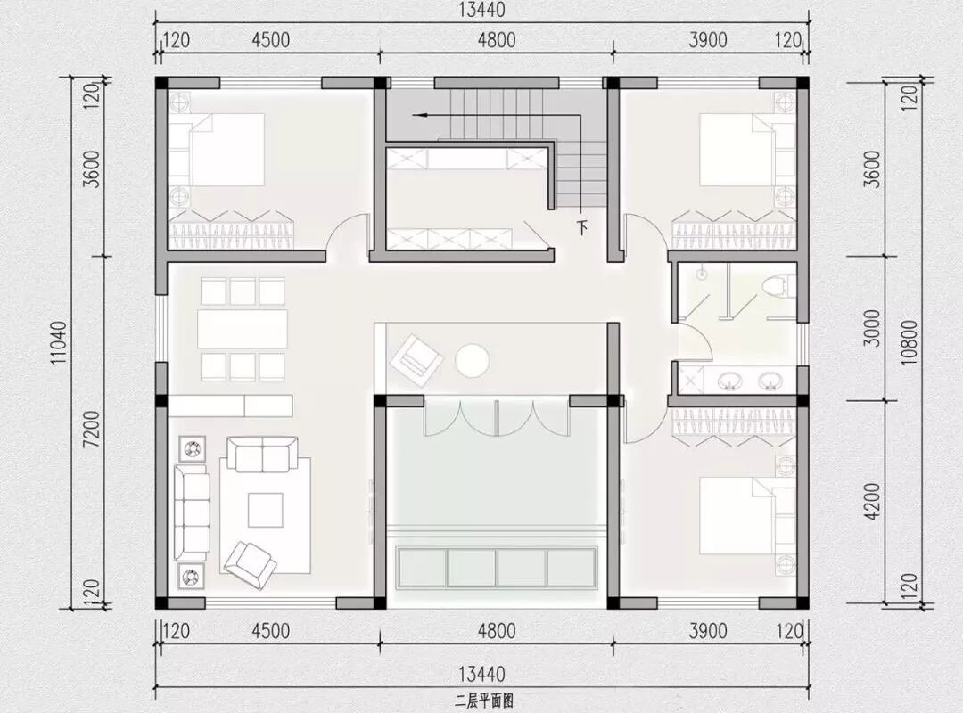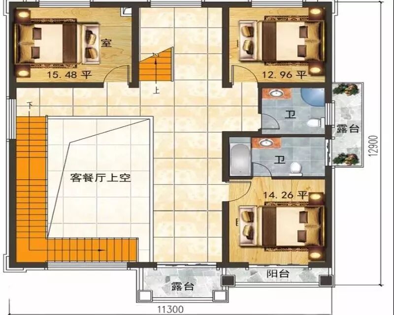 二层设有:起居室、3间卧室、衣帽间、卫生间、露台。