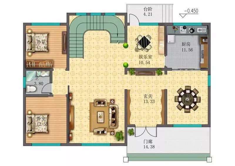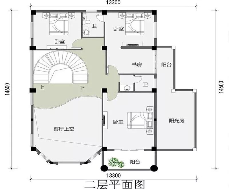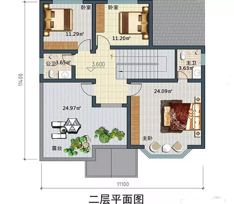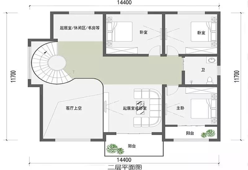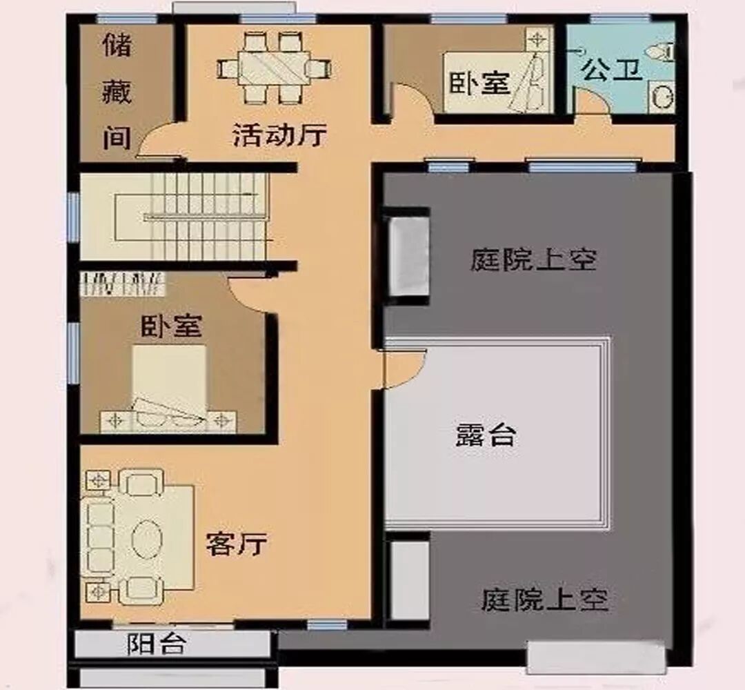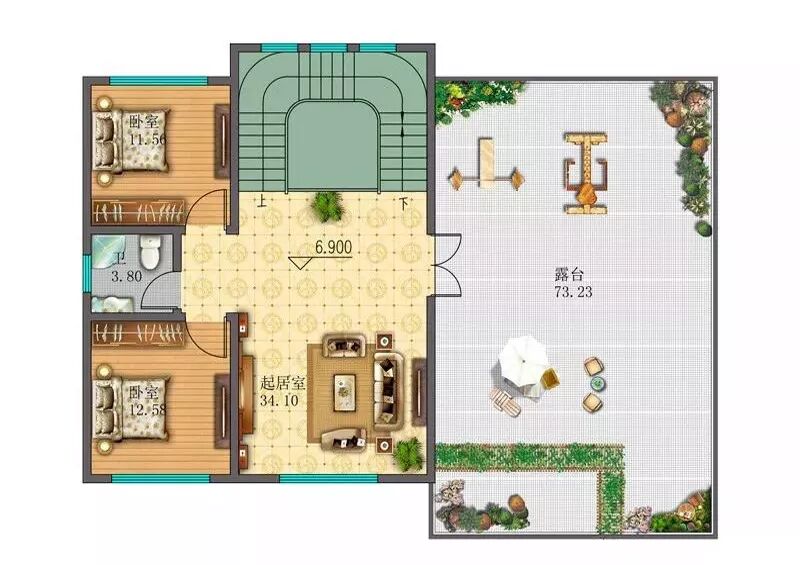 二层设有:客厅、2间卧室、活动厅、储藏间、卫生间、阳台和露台。