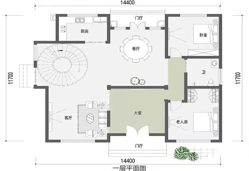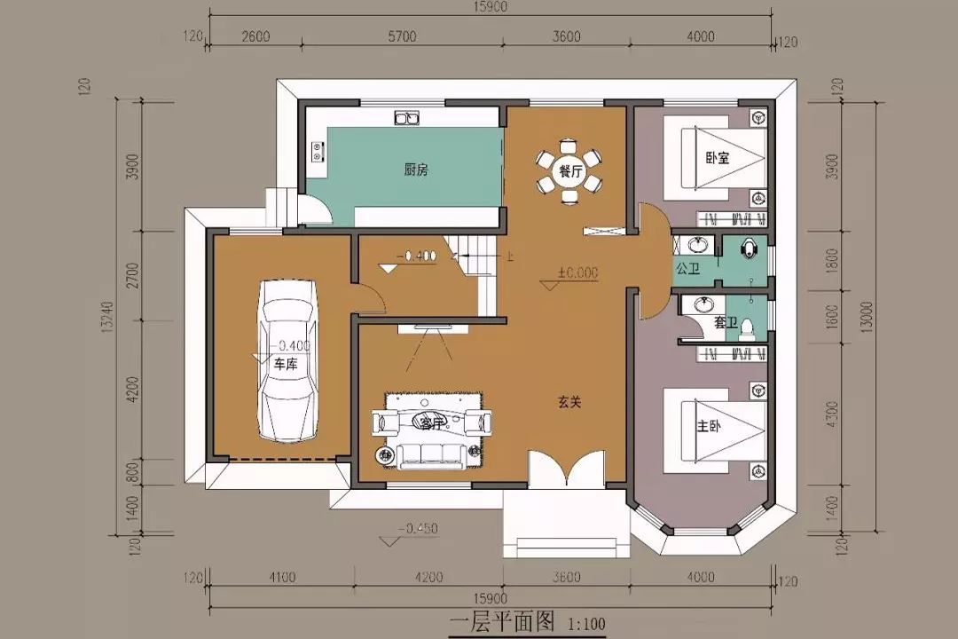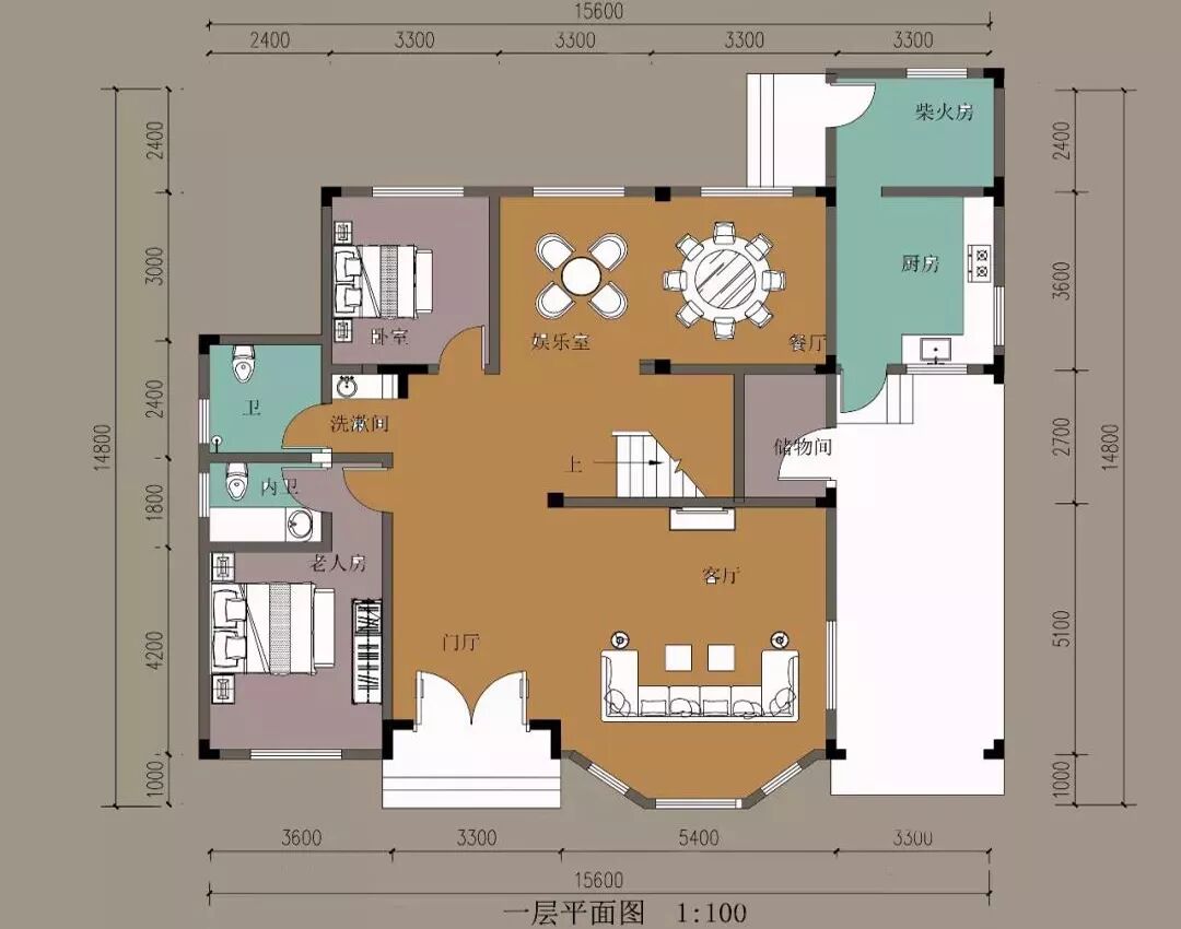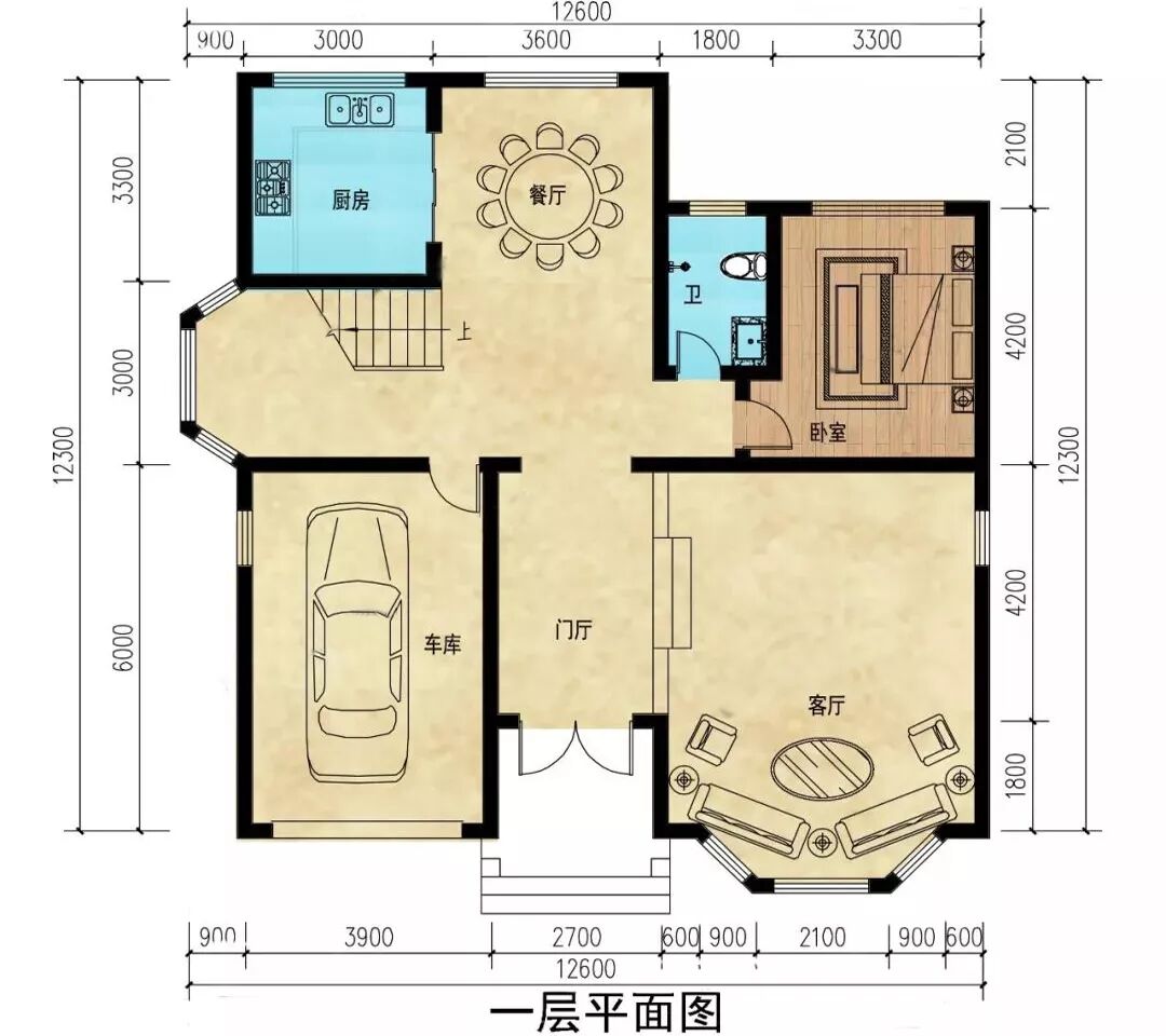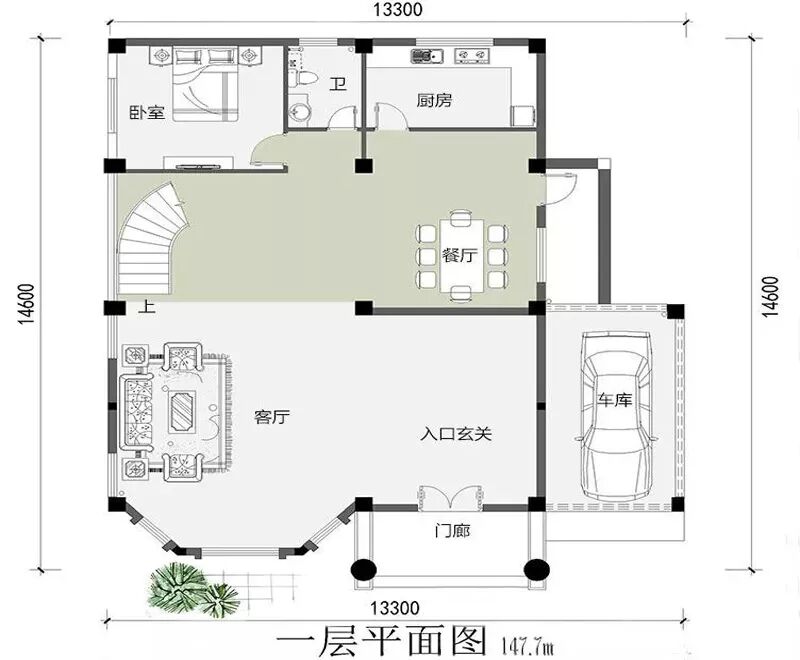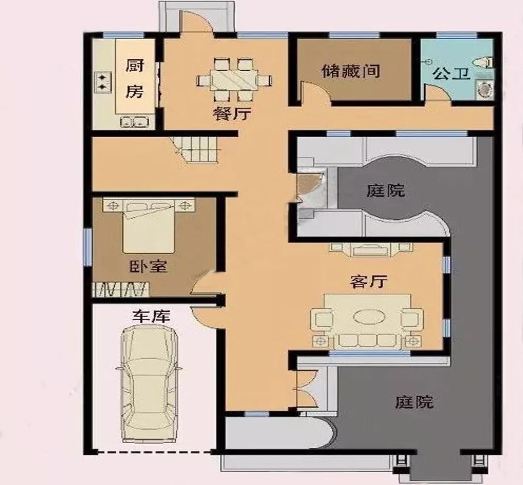一层设有:庭院、客厅、餐厅、厨房、卧室、卫生间、储藏间、车库;